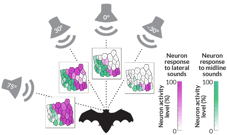 There are two overlapping maps in the cortex, one for horizontal and one for vertical angles. For the horizontal angle, one group of neurons fires when a sound comes in from directly in front of the bat’s nose. Other groups respond to sounds to the left or the right of the animal. The auditory cortex on the right side of the brain responds to sounds in what Razak refers to as the left “hemifield” — anywhere to the left side of the head. The more right-brain neurons are firing, the more directly to the left the sound is. The same thing happens on the left side of the bat’s brain, for sounds on the right.