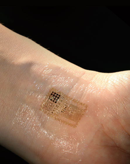 Silicon wafers are lousy for making skin electronics. “In terms of mechanics,” Rogers says, “they’re basically like a plate of glass.” When the body twists and bends, they break.