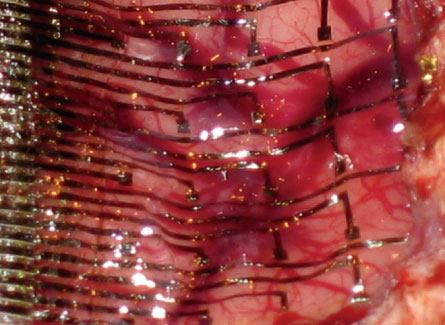 In 2010, Rogers, Omenetto and colleagues tested a silk-coupled electronic device on a feline brain. They placed the silk-backed mesh circuit onto the visual cortex of an anesthetized cat and monitored brain activity. Compared to thicker devices, the mesh molded more closely to the brain and recorded stronger signals. In people, such flexible devices may one day control prosthetic arms, map brain activity or quell seizures in epileptic patients.
