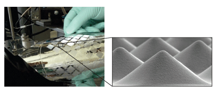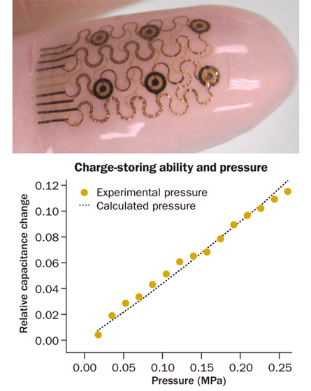 In 2010, Bao’s team made a sensing system that works a little differently by sandwiching a layer of microstructured rubber between two charge-holding metal grids. When pressure is applied to the grids, the amount of charge changes. The pattern of holes carved into the rubber bumped up its sensitivity: Even a butterfly-light touch compressed the cutouts, Bao and colleagues reported in Nature Materials.