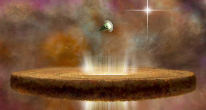 DUST BUSTER In the Orion Nebula, some dusty disks surrounding young stars, as seen in this artist’s rendition, survive despite their proximity to Theta1 Orionis C, the bright star shining in the background. Stars closer to the massive star have lost most of their dust.