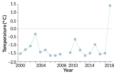 Although the dramatic absence of sea ice last winter was startling, waters in the Arctic have actually been on a decades-long warming trend. In the southern Chukchi Sea, freeze-up has happened about half a day later each year since 1981, Stabeno and colleagues reported in November in Deep-Sea Research. And in the northern Bering Sea, mooring M8’s data show particularly stark changes over the last four years. From 1981 to 2014, freeze-up happened on average by the end of December. But since 2014, freeze-up hasn’t occurred until January or February — or, in 2018, not at all.
