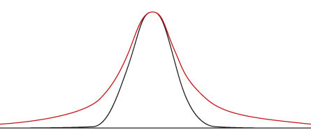 SPOTTING A TAIL Some models assume that financial data follow a typical bell curve (black), with data points clustered around an average and then tapering off quickly to either side.