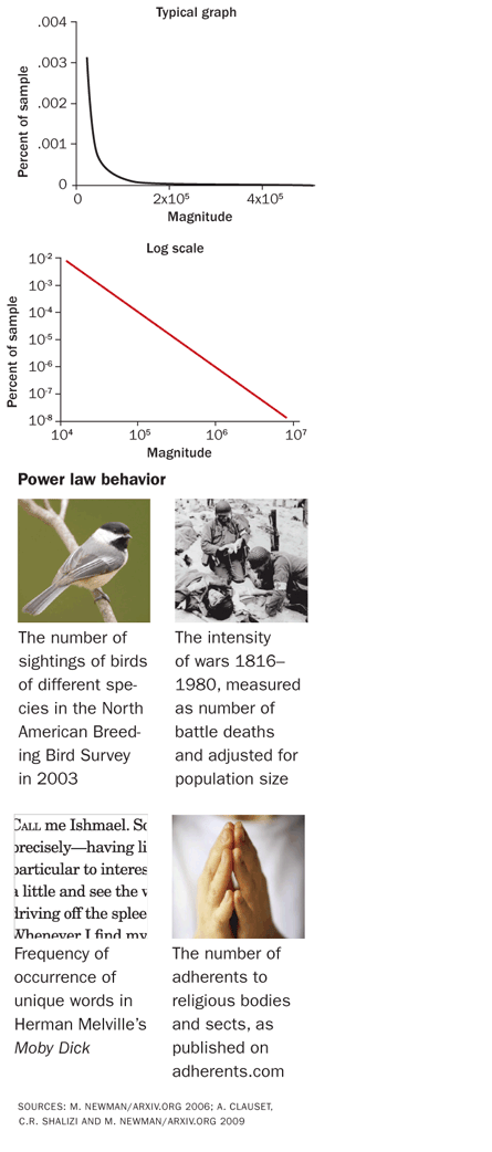When displayed on a typical graph, data that follow a power law distribution form a long tail (below, top graph). But graph the same data on a log scale and they fall onto a straight line (bottom graph). By applying several statistical tests, a recent analysis identified data sets that probably show power law behavior (bottom).