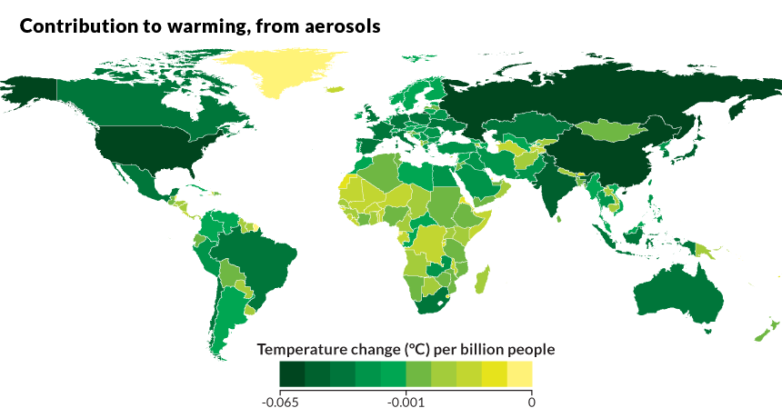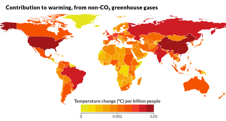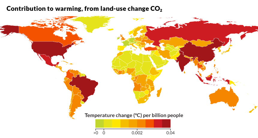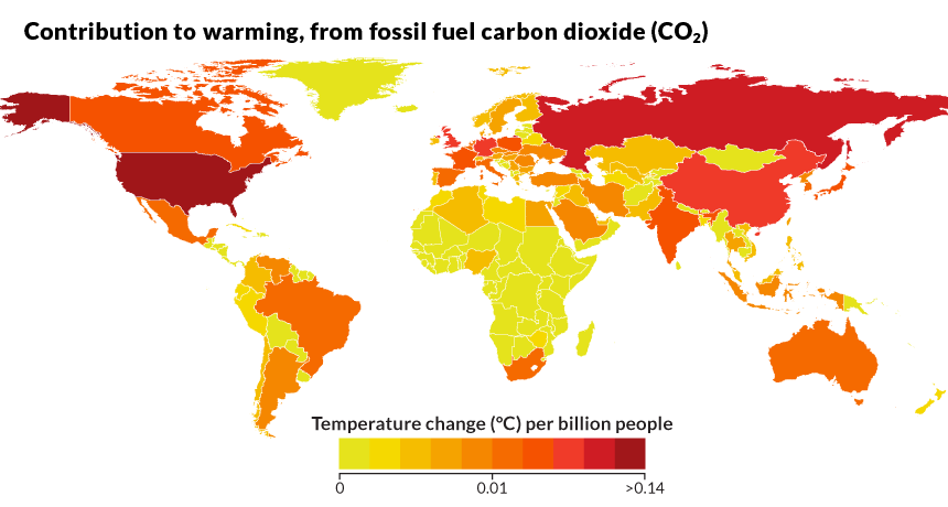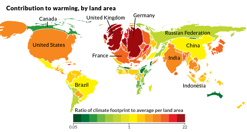 Nations add to warming through fossil fuel use, land-use change and other effects. In a cartogram (final slide, above), a nation’s size expands if its warming contribution is large for its geographic area and contracts if emissions are low per unit area.