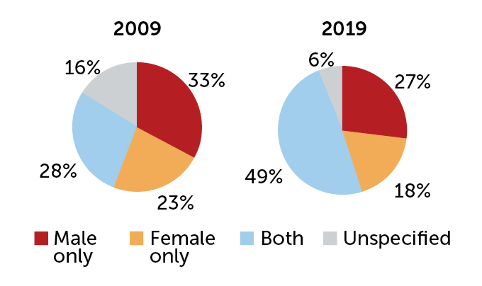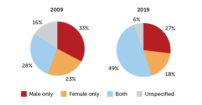 In 2009, only 28 percent of biomedical studies used both male and female subjects, while 33 percent were male-only and 23 percent were female-only. Another 16 percent of studies did not state which sex they used. In 2019, studies with both males and females jumped to 49 percent, male-only studies dropped to 27 percent, and female-only studies dropped to 18 percent. The studies that didn’t specify sex dropped the most, to only 6 percent of studies surveyed.