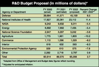 In President Bush’s fiscal year (FY) 2002 budget request, released April 9, overall research and development (R&D) funding would grow by 3.7 percent, to $95.1 billion in 2002. Nonetheless, the budgets of almost all top civilian R&D agencies would shrink. Only the National Institutes of Health would come out a winner.