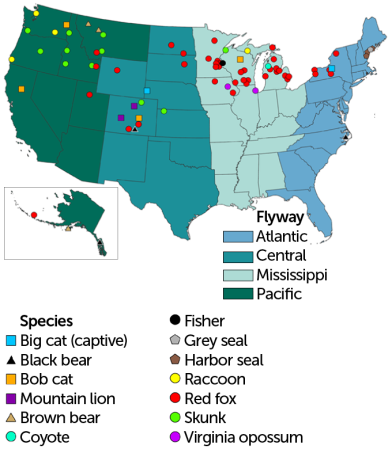 A variety of mammal species have tested positive for avian influenza across the United States. Each symbol represents the counties that have reported cases. States colors indicate the routes birds take, called flyways, as they migrate south for the winter or north for the summer.