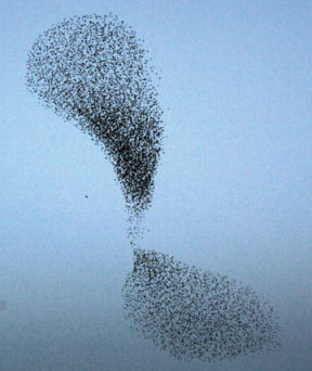 On winter evenings in some southern European towns, tens of thousands of starlings congregate over their roosts. Above the ruins of Rome’s ancient Baths of Diocletian, huge black clouds of starlings assemble and continually morph into new shapes, possibly to signal their position to buddies who are still navigating their way home.