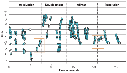 One narrative begins with the mother uttering low-pitched phrases, such as “come on” and “that’s clever,” for five seconds. Her daughter’s voice rises in response and the mother moves her vocal pitch an octave higher. Mom prompts responses from baby for about eight seconds. Their voices rise to a peak of intensity during a back-and-forth exchange that lasts another seven seconds. Mother and daughter then take six seconds to return to the mother’s original, low voice pitch. So, Malloch says, each collaborative story contained an introduction, development, climax and resolution.