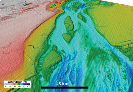 A sonar survey just south of England revealed a 100-km-long, submerged feature that scientists have dubbed the Northern Paleovalley. This valley, which contains little if any sediment, is as much as 50 m deep in spots, says Gupta. Large, flat-topped islands in the valley have streamlined shapes, suggesting that they were carved by massive amounts of water flowing over what had been dry land. Broad grooves carved into the bedrock, some of them at least 100 m wide and 15 km long, curve to follow the valley’s terrain—a hint that the features were quickly created by a colossal deluge.