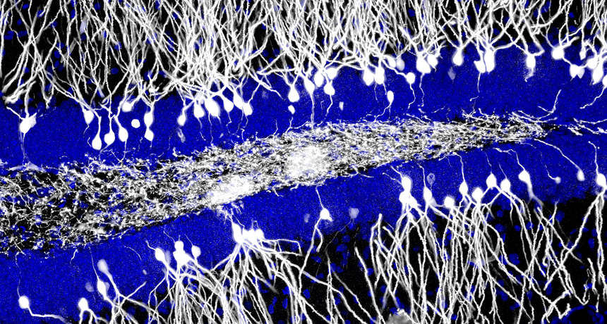 WIPE OUT During infancy, in humans and some animals, a memory center of the brain called the hippocampus (blue) churns out new neurons (white). These cells may mess up early memories and could explain why adults can’t remember being babies or toddlers.
