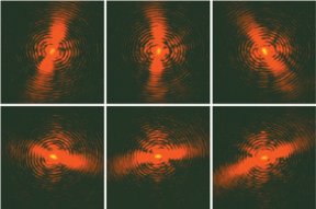 When the researchers used so-called circularly polarized laser beams, whose electromagnetic fields corkscrew through space, the light caused the disks–and their twin beams–to spin. Reversing the orientation of the corkscrew made the disks spin the other way. A single rotating disk projects visible red streaks onto the ceiling of the unlit lab, Mason says.