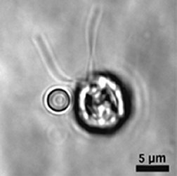 When the researchers shined a low-intensity visible light from the end of the track opposite the algae, the organisms swam toward the light, each cell beating its two flagella breaststroke-style. When the algae reached the midpoint, they collided with the beads. The sticky molecules linked one or two beads to each cell, and the cells continued moving toward the light.
