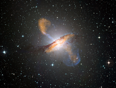 The nearby galaxy Centaurus A has two vast particle jets that shoot out from the vicinity of the galaxy’s central black hole and extend far beyond the galaxy’s visible outlines. The radio images shown here are the sharpest images of any black hole jets ever obtained, revealing features just 15 light-days across.