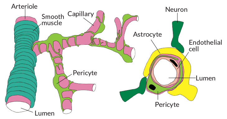 The cells in and around the brain’s blood vessels somehow carry messages that change blood flow. Scientists are scrutinizing the role of astrocytes, smooth muscle cells, pericytes and endothelial cells, which surround the lumen, the channel where blood flows.