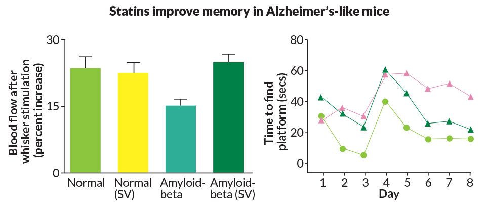 Statin treatment improved the memory of middle-aged mice engineered so their brains produce gobs of sticky amyloid-beta, the protein that piles up in people with Alzheimer’s. Three months on the statin simvastatin restored short- and long-term memory in these mice, neuroscientist Edith Hamel of McGill University in Montreal and colleagues reported in 2012.