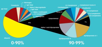 By itself, albumin makes up about 60 percent of the serum-protein content, says Pounds. The 10 most abundant proteins–which include antibodies, the iron transporter called transferrin, and fibrinogen–account for more than 90 percent of all plasma protein. Many other proteins are present at extremely low relative concentrations. For example, albumin’s concentration is 5 to 10 billion times that of the immune system signal interleukin-6.