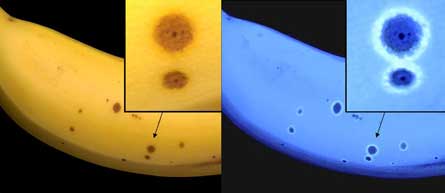 In the new study, reported online September 7 in Proceedings of the National Academy of Sciences, the team determined what happens under UV light when the bananas become overripe. Though the brown spots themselves are dull, the team found that a ring of flesh surrounding the spots glows with an intensity three times that of the yellow peel. By analyzing the light, the researchers found that the chlorophyll-breakdown chemicals were more abundant in the rings than elsewhere in the banana.