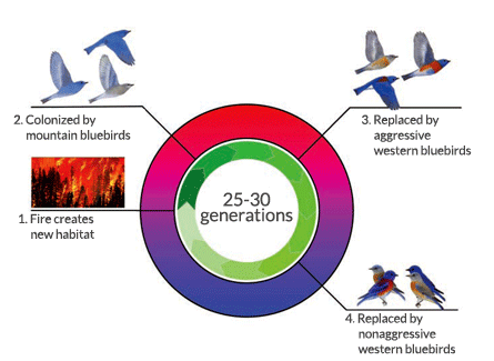 Duckworth and her colleagues have been following large-scale bluebird wars between the western and mountain species in the northwestern United States for 15 years. Both species thrive where forest fires leave plenty of cavity-riddled damaged tree trunks for nesting and create new open space rustling with grasshoppers and caterpillars to eat.