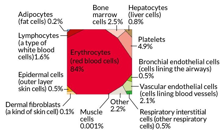 An average adult human man’s body contains about 30 trillion human cells, most of them red blood cells. Pictured is a breakdown of the most common cell types.