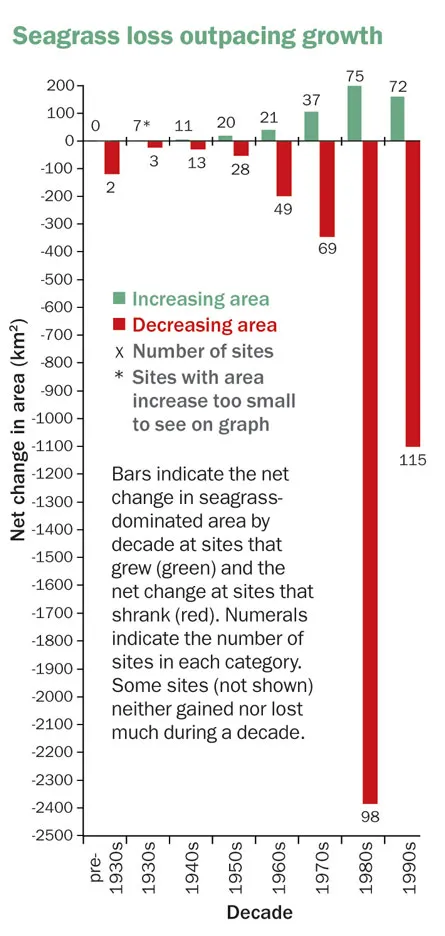 This spectacle’s future, and that of the other seagrass beds in shallow coastal waters around the world, looks iffy. Long-term data on the extent of seagrass meadows aren’t great, but combined there’s enough to sketch trends along populous coasts, says Jud Kenworthy, also of NOAA’s Beaufort research station. Along the coasts of North America, Australia and Europe, nearly a third of the known seagrass landscape has disappeared since the 1870s, an international research team including Kenworthy reports July 28 in the Proceedings of the National Academy of Sciences.