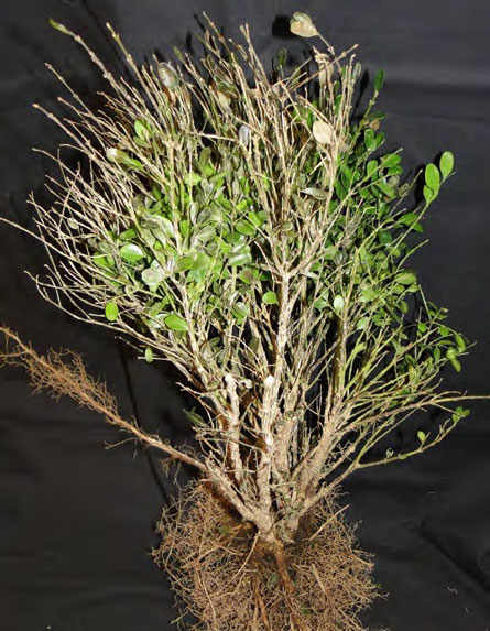 The blight starts with spots on leaves and black streaks on twigs. Within a few weeks, a plump shrub can turn into a clump of bare sticks.