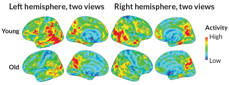 Other observations of the old brain seem to fit this idea. Language, for instance, is handled by the left side of the young adult brain. But in elderly people, both hemispheres are required to handle the job. And in older people, remembering can activate both sides of the frontal cortex, instead of just one as in younger people.