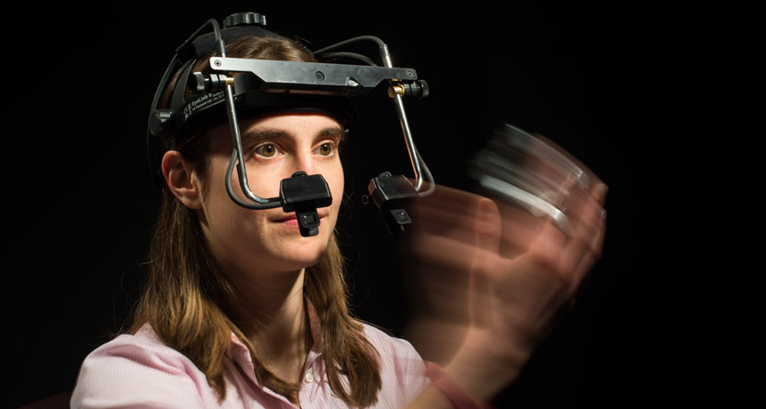 DARKNESS VISIBLE A volunteer wears an eye-tracking device as she reenacts a study, in which blindfolded people could vaguely see their hands moving in total darkness. Researchers say the feat may be possible because of connections between the brain’s motion and visual senses.