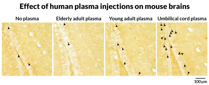 Every fourth day for two weeks, Castellano and colleagues injected old mice with human plasma taken from umbilical cords, young adults and elderly adults. The source of plasma infusion changed the behavior of genes in the hippocampus, the researchers found. Elderly mice that had received umbilical cord or young adult plasma showed gene behavior changes that go along with improved hippocampal functioning. And after infusions of human cord plasma, more hippocampus cells churned out a protein called c-Fos, a marker of a busy brain that’s known to decline with age. Elderly mice that received elderly human plasma showed no such changes.