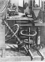 Friction foils this optimistic 17th-century plan to both grind grain (M) and lift water.