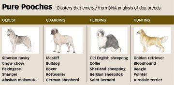 The computer analysis also revealed three other clusters of dogs. They appear to have originated from European efforts to create breeds specialized for hunting, which include bloodhounds and golden retrievers; guarding, such as mastiffs, bulldogs, boxers, rottweilers, and German shepherds; and herding, such as collies and Belgian sheepdogs. Somewhat surprisingly, says Venta, genetics puts greyhounds and Saint Bernards in the herding cluster.