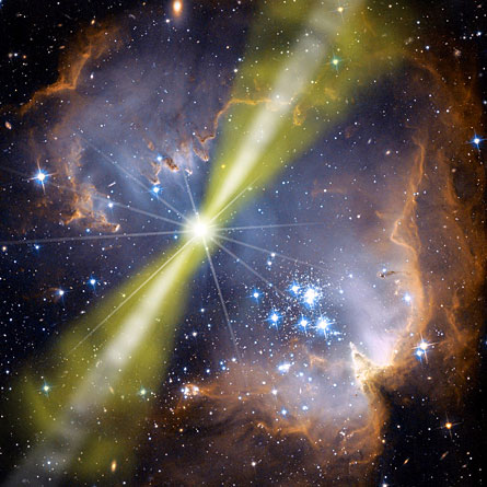 According to that model, a burst occurs when a jet of material breeches the surface of a massive star and zooms far beyond it. Collisions between blobs of material within the jet produce the gamma rays. The data collected on GRB 080319B strongly suggest that the earliest visible-light photons from the burst, produced during the first 50 seconds, are also generated within the jet but by a different process.