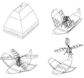 The team envisions the Mars-exploring versions–existing now only in designs and computer simulations–as hunkering down on the flat top of a wheeled rover like fighter jets hugging the deck of an aircraft carrier. “This whole unit will explore slowly across the surface. The entomopters fly off and come back, and they guide the rover,” says Colozza.