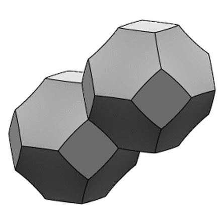 Unlike Kelvin’s structure, the Weaire-Phelan foam was built from two different shapes. One was a slightly curved dodecahedron and the other was a 14-sided shape with two opposite hexagonal faces and 12 pentagonal faces. Despite the different shapes, Weaire made sure all the bubbles had the same volume. The resulting surface area was a whopping 0.3 percent less than that of Kelvin’s foam.