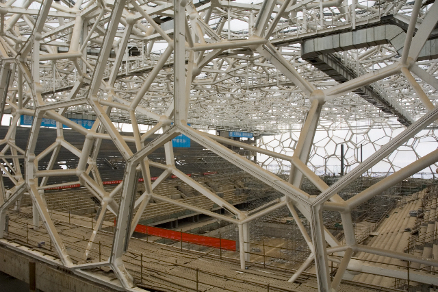 The NationalAquaticsCenter in Beijing, newly built for the Olympics, is a glowing cube of bubbles. The walls, roof and ceiling of the “Water Cube” are covered — indeed, made from — enormous bubbles that seem to have drifted into place randomly, as if floating on the surface of a pool.