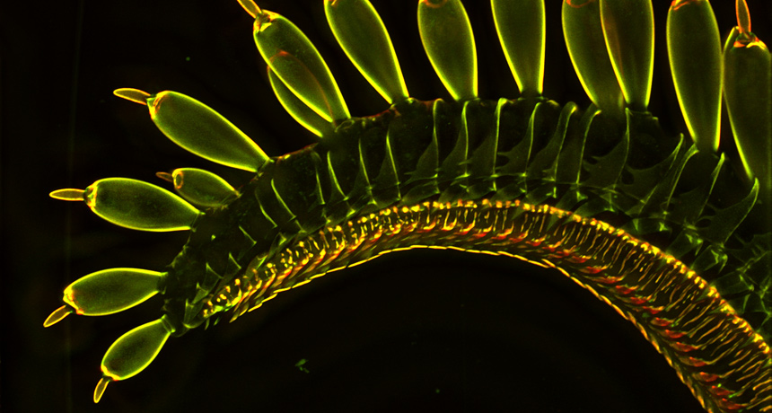 SIPPY WHEN WET The magnified tip of a Limenitis archippus butterfly mouthpart shows bowling-pin-shaped sensory structures that help the insect sip.