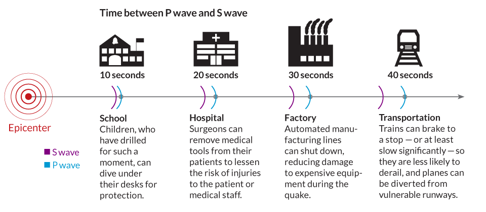 Earthquake early warning systems rely on the fact that quakes produce several types of seismic waves. The first to arrive are P, or primary, waves and after that come S, or secondary, waves.