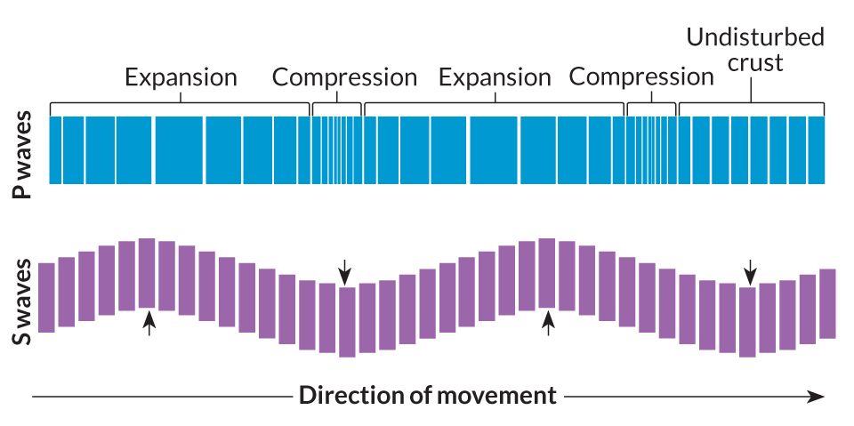 P waves travel as a series of contractions and expansions through Earth’s crust, while S waves travel by shearing material at right angles to their direction of movement. (Click image to enlarge)