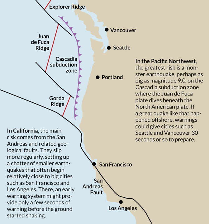 California is the capital of U.S. earthquake early warning because it is the state with the highest seismic activity (after sparsely populated Alaska) and it already has the densest network of seismometers. The Pacific Northwest, however, faces the prospect of an earthquake that could dwarf even a Big One in California.