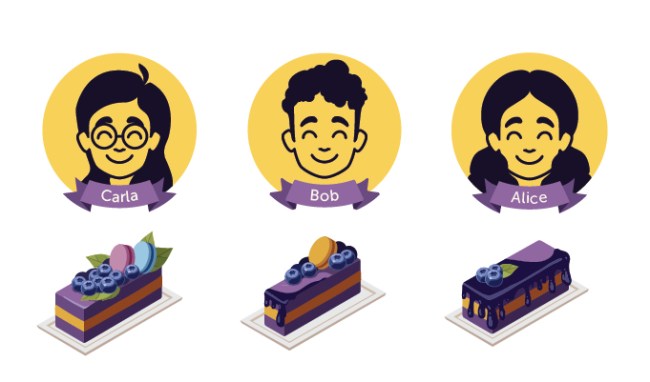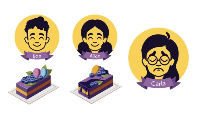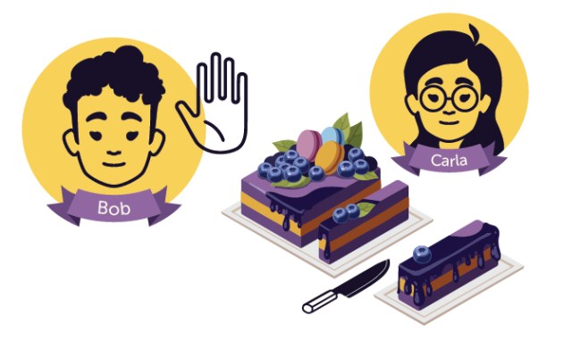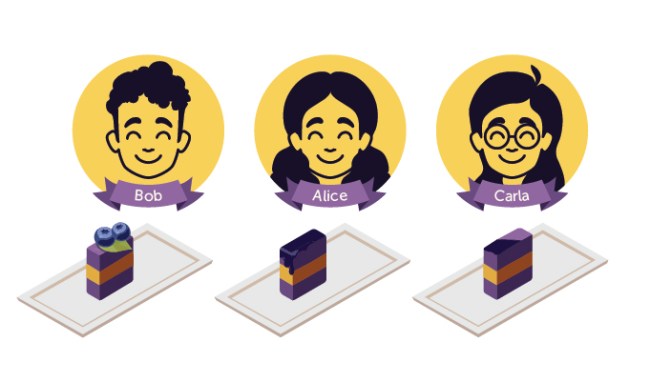 Bob chooses his preferred slice. Alice gets the remaining slice. Everyone appears to be happy with their piece. But Carla, who exited the game early, could still think that Alice’s or Bob’s piece is better than hers. OLENA SHMAHALO