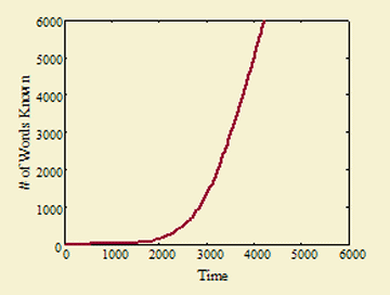 As a first approximation, he assumed that a word is more difficult the less frequently it appears in written language or in mothers’ speech to their children—statistics that are both readily available. He then noted that many other factors must influence difficulty, such as the part of speech, the complexity of the sound pattern, and whether the word’s meaning is concrete or abstract. Putting all of these factors together, he came up with a roughly bell-shaped distribution with fewer easy and hard words than intermediate words. That distribution, plugged into McMurray’s model of learning, naturally produced a rapid rise in rate of words learned following a relatively slow start.