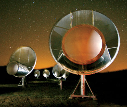 At an American Astronomical Society meeting in January, Harp described the array’s ability to search at a frequency of 4.462336275 gigahertz, in what’s called the PiHI range, because it’s the hydrogen atom’s emission frequency times pi, another value ET might know. Other similar systems — the Low Frequency Array headquartered in the Netherlands, the Atacama Large Millimeter/submillimeter Array under construction in Chile and the Square Kilometer Array (location to be determined) — will follow the Allen array’s lead. All of these systems, basically big telescopes built from small ones, will also cover more sky than their single-dish counterparts.