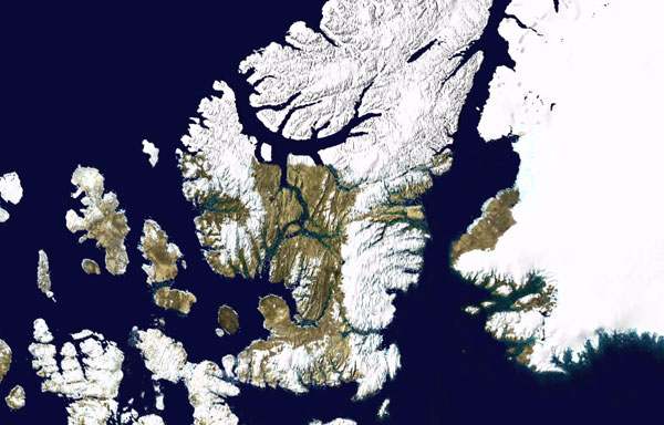 THREATENED ICE During the 21st century, glacial melt in the Canadian Arctic Archipelago (including Ellesmere Island, shown in a satellite view) could raise global sea level by 35 millimeters, a new study finds. NASA