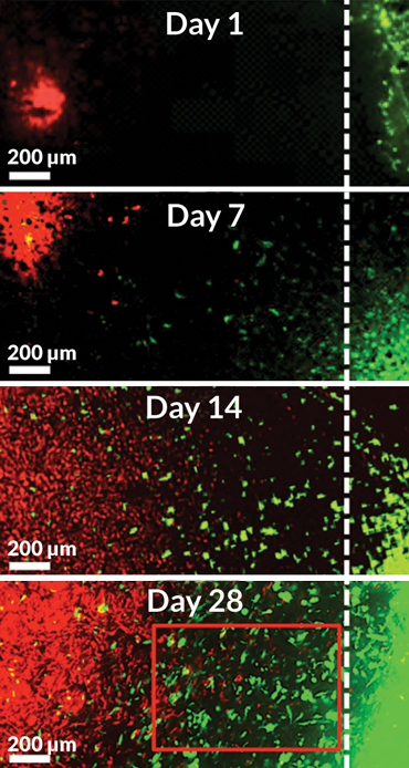 ON THE OFFENSIVE Gene-edited cancer cells (green) release a protein deadly to other tumor cells (red).