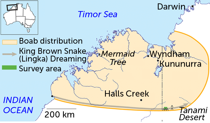 Boab trees grow in the northwestern corner of Australia. A survey (green rectangle) of a region on the edge of the Tanami Desert revealed a patch of boab trees carved with dendroglyphs, which tie the region to the path (gray arrow) of the King Brown Snake Dreaming, or Lingka Dreaming. This ancient trail connects cultural sites and stories across hundreds of kilometers and mirrors the journey of Lingka, one of the spiritual beings that shaped the landscape into its present form.