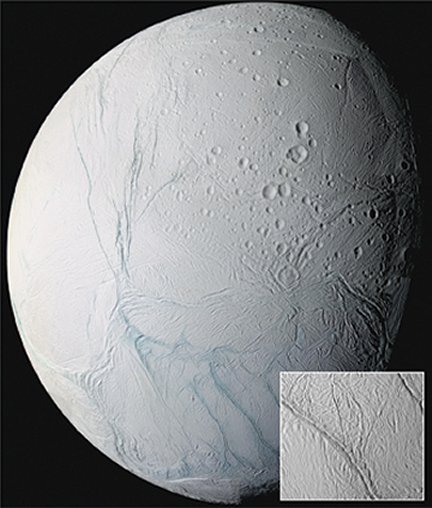 The false-color image above shows long fractures (blue), about 100 meters wide. Fractures, including those in the inset, may release icy material that vaporizes, contributing to the thin atmosphere that Cassini previously detected around Enceladus (SN: 4/16/05, p. 253: Available to subscribers at A moon with atmosphere). It’s still a mystery why this moon, only 500 km in diameter, exhibits such diverse topographic features, says Cassini scientist Carolyn Porco of the Space Science Institute in Boulder, Colo.