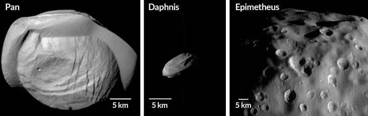 Cassini’s last flybys of five of Saturn’s ring-dwelling moons — including Pan, Daphnis and Epimetheus (below in gray-scale images) — showed that their colors varied with distance from the planet. That suggests they’re picking up ring debris, scientists say.