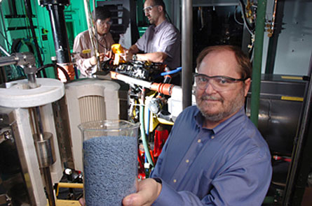 NEW USE FOR OLD CATALYST Chris Marshall, foreground, of Argonne National Lab holds a container of a new material that could help heavy-duty trucks spew much less nitrogen oxide, a major component of smog.