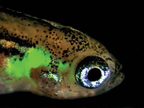 Glowing zebrafish, like this one, may provide insight into the spread of human leukemia and other cancers in which a gene called MYC promotes cell growth. Researchers fused the mouse version of MYC to a gene encoding a fluorescent-green protein and inserted the combination into zebrafish DNA. They injected this DNA into embryos to create lines of fish in which the gene is active in some immune cells. The resulting cancerous cells, which arise in the thymus and migrate initially to the gills and eyes, glow brightly in the transparent fish. A. Thomas Look of the Dana-Farber Cancer Institute in Boston and his colleagues, who describe their work in the Feb. 7 Science, plan to introduce mutations into such fish to identify genes that speed or slow the spread of MYC-driven cancer cells.